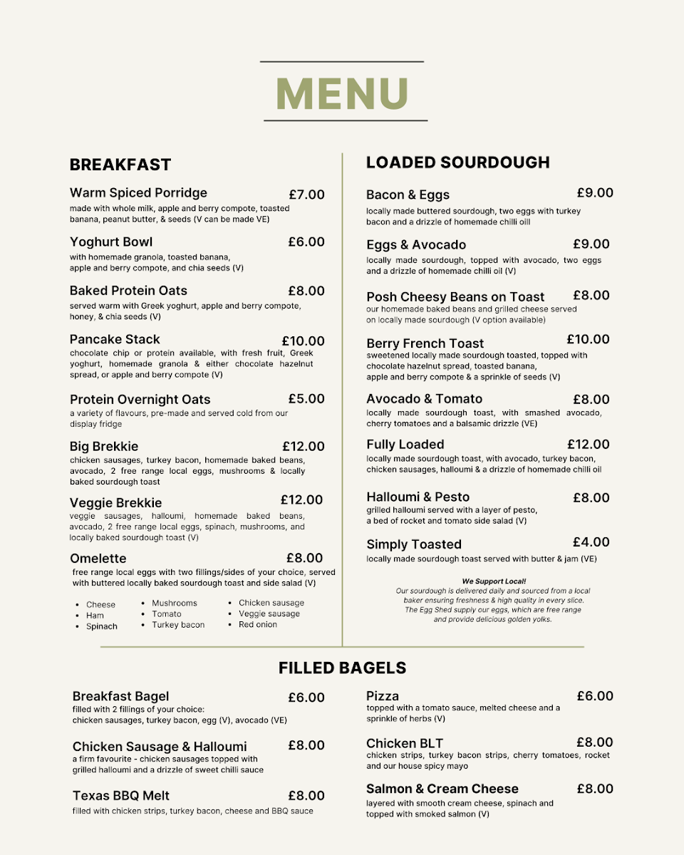 - Filled Bagels: Start with mouthwatering options like the Breakfast Bagel or Chicken BLT, priced from £6.00 to £8.00.