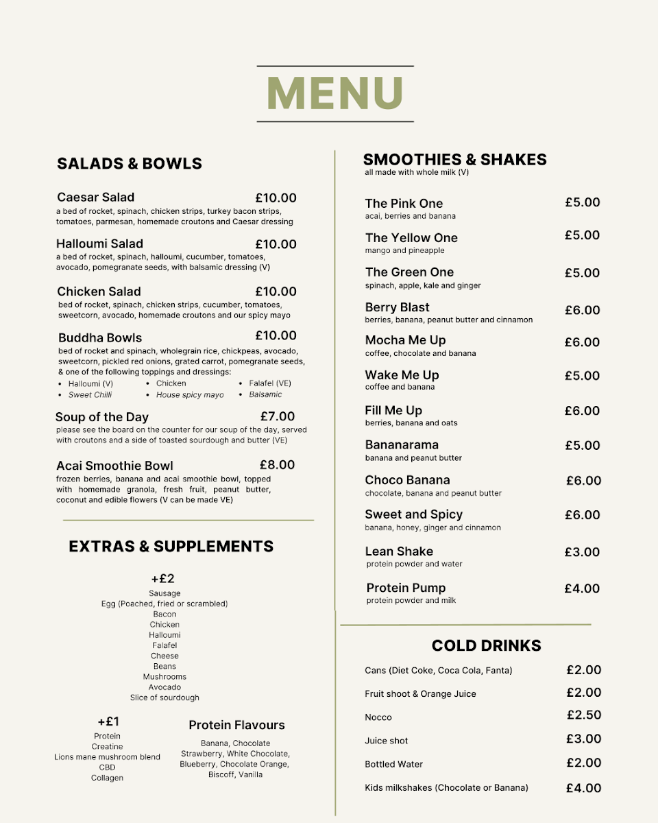 - Smoothies: Revitalize your day with expertly crafted smoothies like the Berry Blast or protein-rich Lean Shake, each at £5.00.